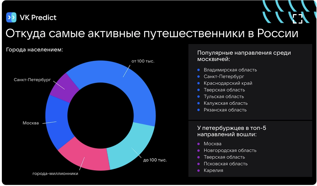 «Самыми популярными направлениями среди москвичей стали Владимирская область, Санкт-Петербург, Краснодарский край и регионы-соседи: Тверская, Тульская, Калужская, Рязанская области. У петербуржцев в топ-5 направлений вошли Москва, Новгородская, Тверская и Псковская области, а также Карелия», — говорится в пресс-релизе.